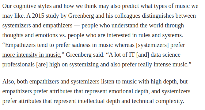 ” The music 14-year-olds listen to helps them define the boundaries of themselves and their friend groups. Scientists have actually drawn up quantitative measures that can anticipate an individual’s musical preferences based on their personality traits.”
